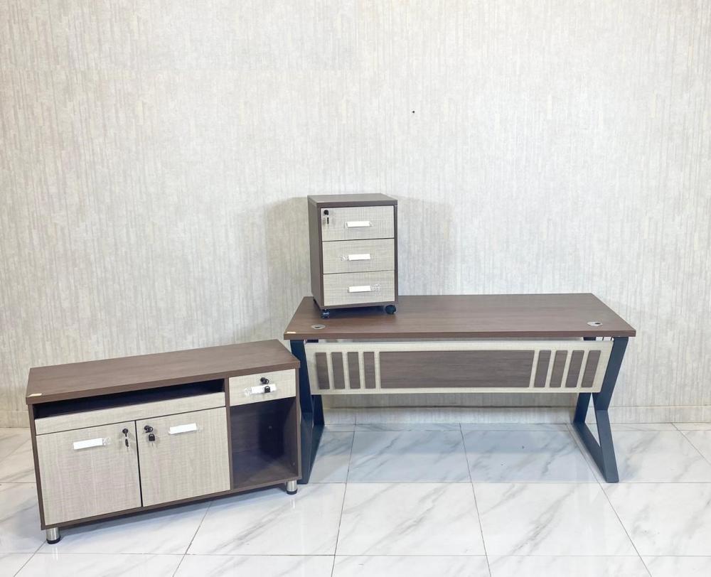 يتميز هذا المكتب بتصميم رائع وملحقات إضافية من وحدة أدراج مكتبية وأيضا دولاب جانبي للحصول في المرحله النهائية وضعية المكتب بحرف ال L , الذي يمنحك مساحه عمل رائعه ..